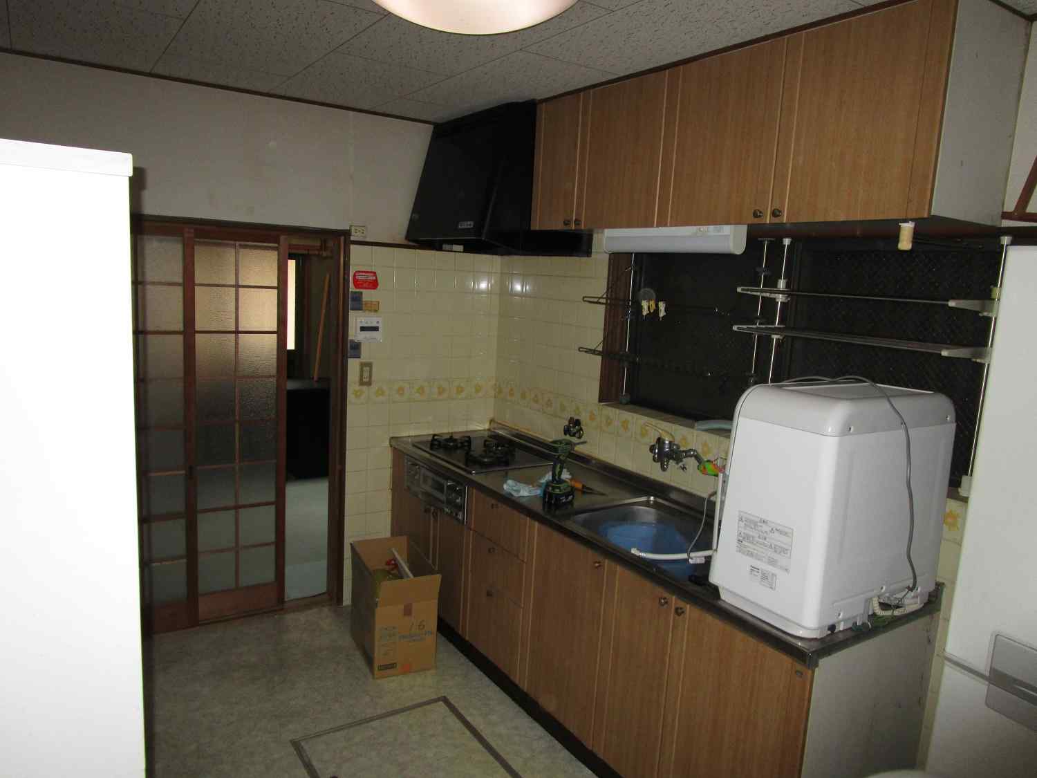 お客様より、『LDKスペースを広く使いたい』というご要望です。このお家の間取りは奥から順に、物入→ダイニングキッチン→リビングという間取りになっています。各部屋には間仕切りが設置してあり、一部屋一部屋が狭く感じます。工事は、各部屋の間仕切りをなくし、一つの空間として使用できるようにしました。工事前のキッチンは、壁付型です。壁付型のキッチンは一般的ですが、今回は横幅に適したリフォームになるので、動線の確保と省スペースを意識しL型を薦めさせていただきました。