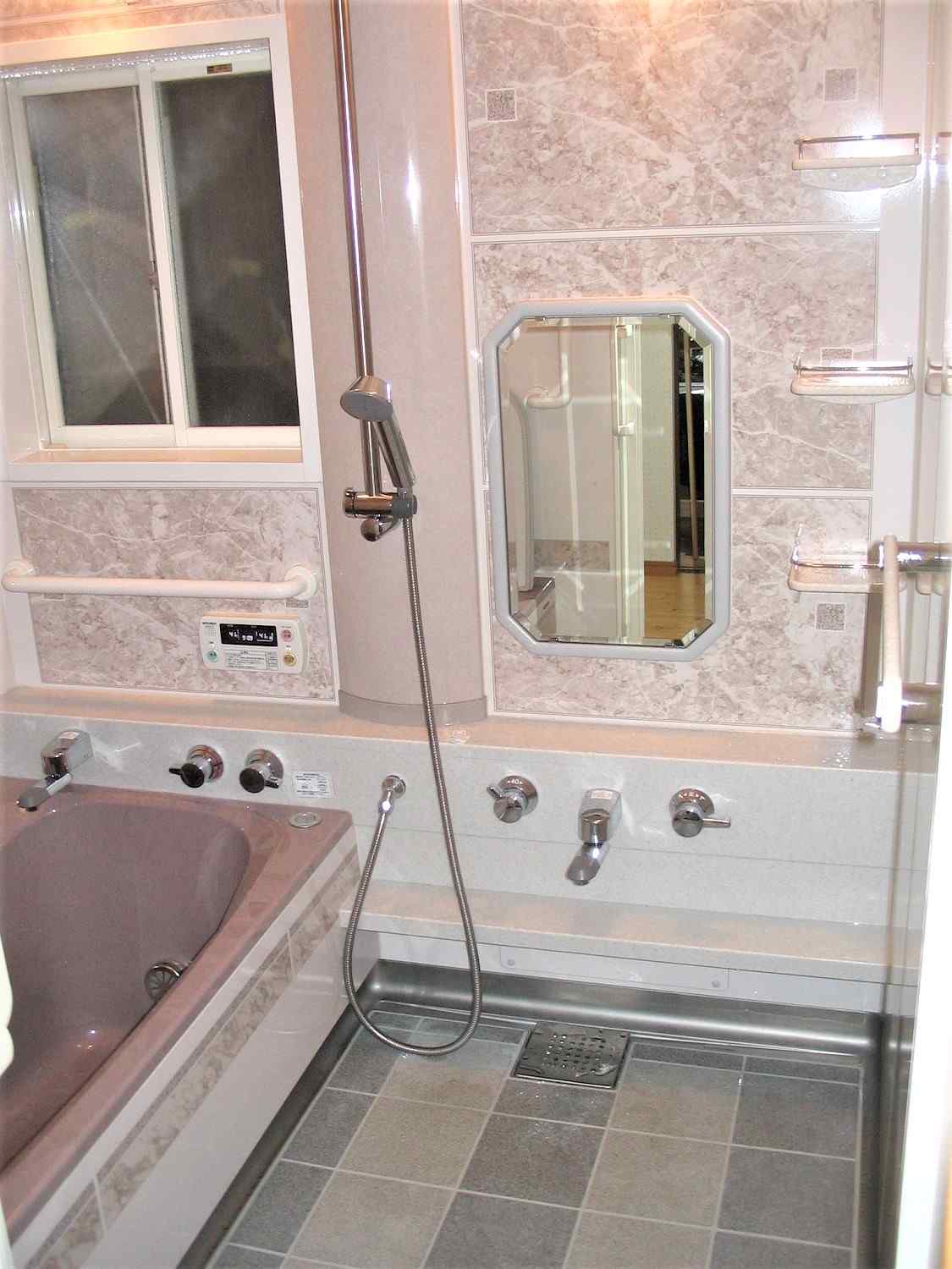 工事前の浴室は、在来工法のお風呂です。冬場は寒く、夏場はタイルに赤カビなどが発生して掃除が大変とおっしゃっていました。浴室ですが、広くしたいとのご要望ですので、浴室内の柱が見えるまで全て解体し、更に壁を移動しました(写真右側開きドア裏)。新浴室はユニットバスです。壁の1面をワンポイントで大理石柄にしています。壁面はツルっと、床面は排水機能が優れているので、入浴後の水が残りにくくなっていて日頃のお手入れがすごく楽になっています。